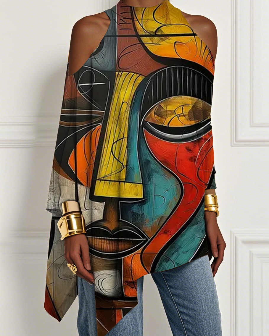Abstract Ethnic Print Irregular Off-shoulder Top