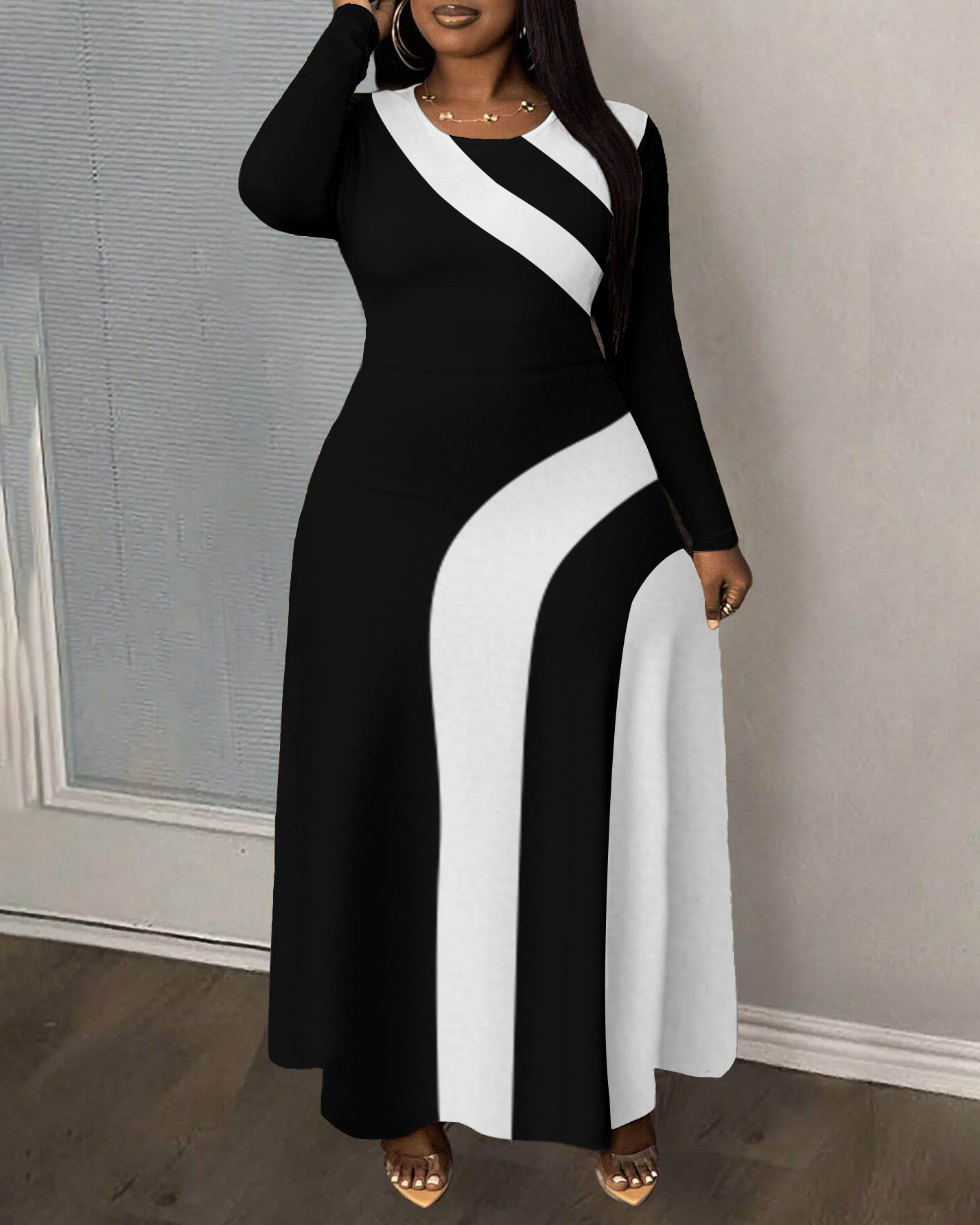 Black and White Wavy Stripes Round Neck Long Sleeve Maxi Dress