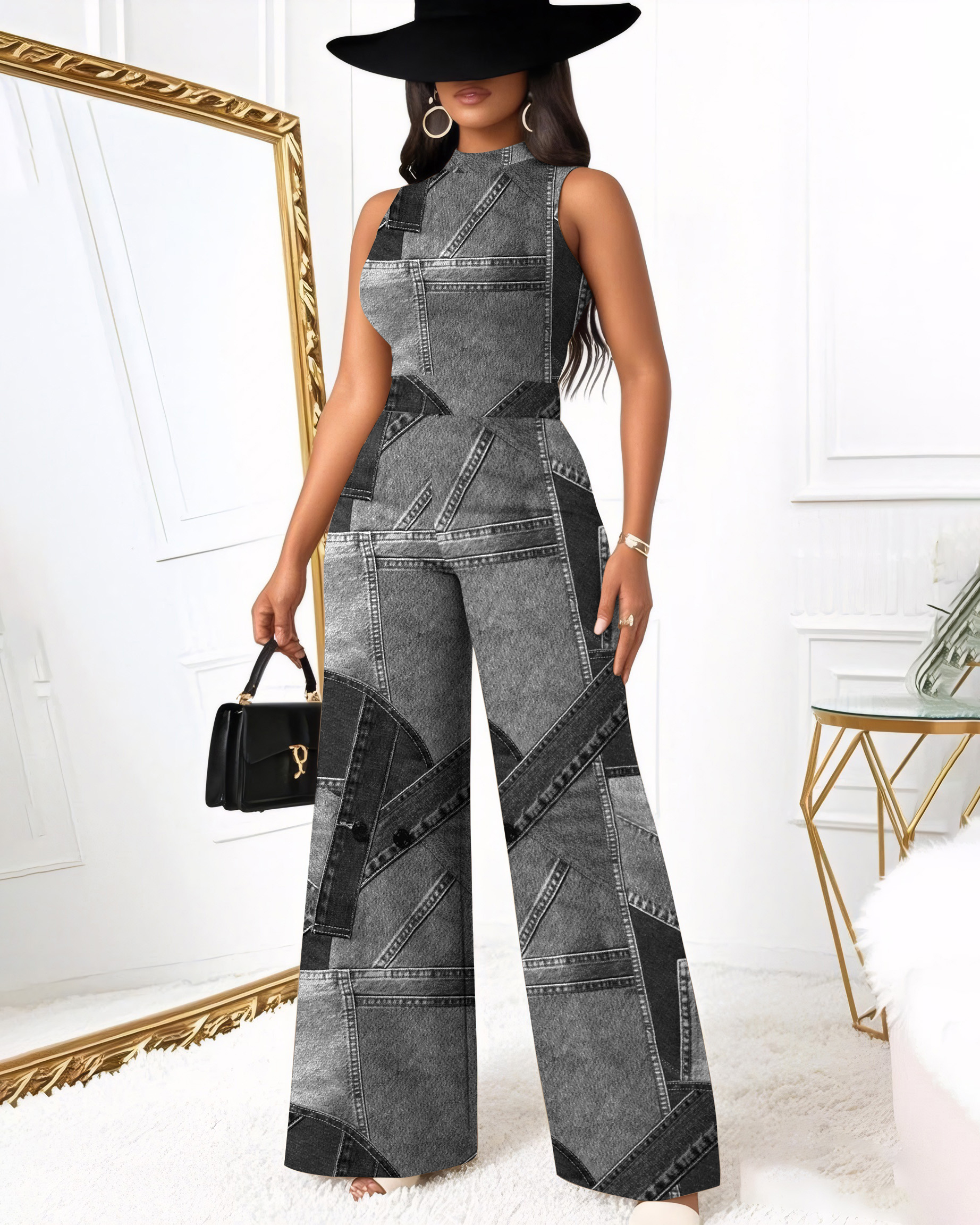 Black Denim Patch Print Wide Leg Jumpsuit