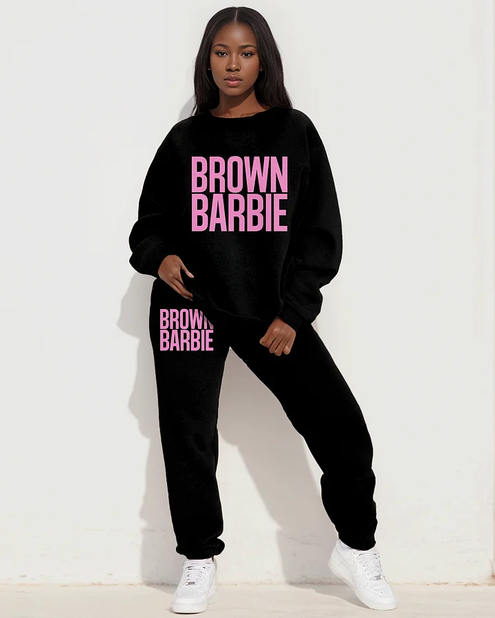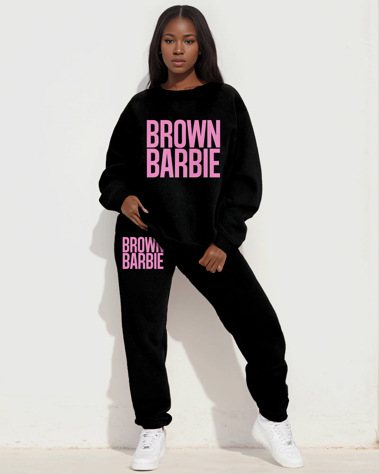 Colorblock Brown Barbie Print Long Sleeve Sweatshirt Two Pieces Set