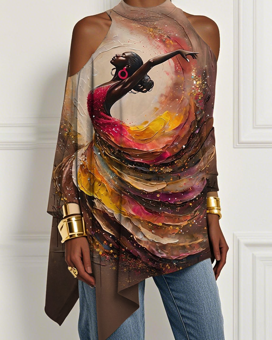 Oil Painting Dancer Print Irregular Off-shoulder Top