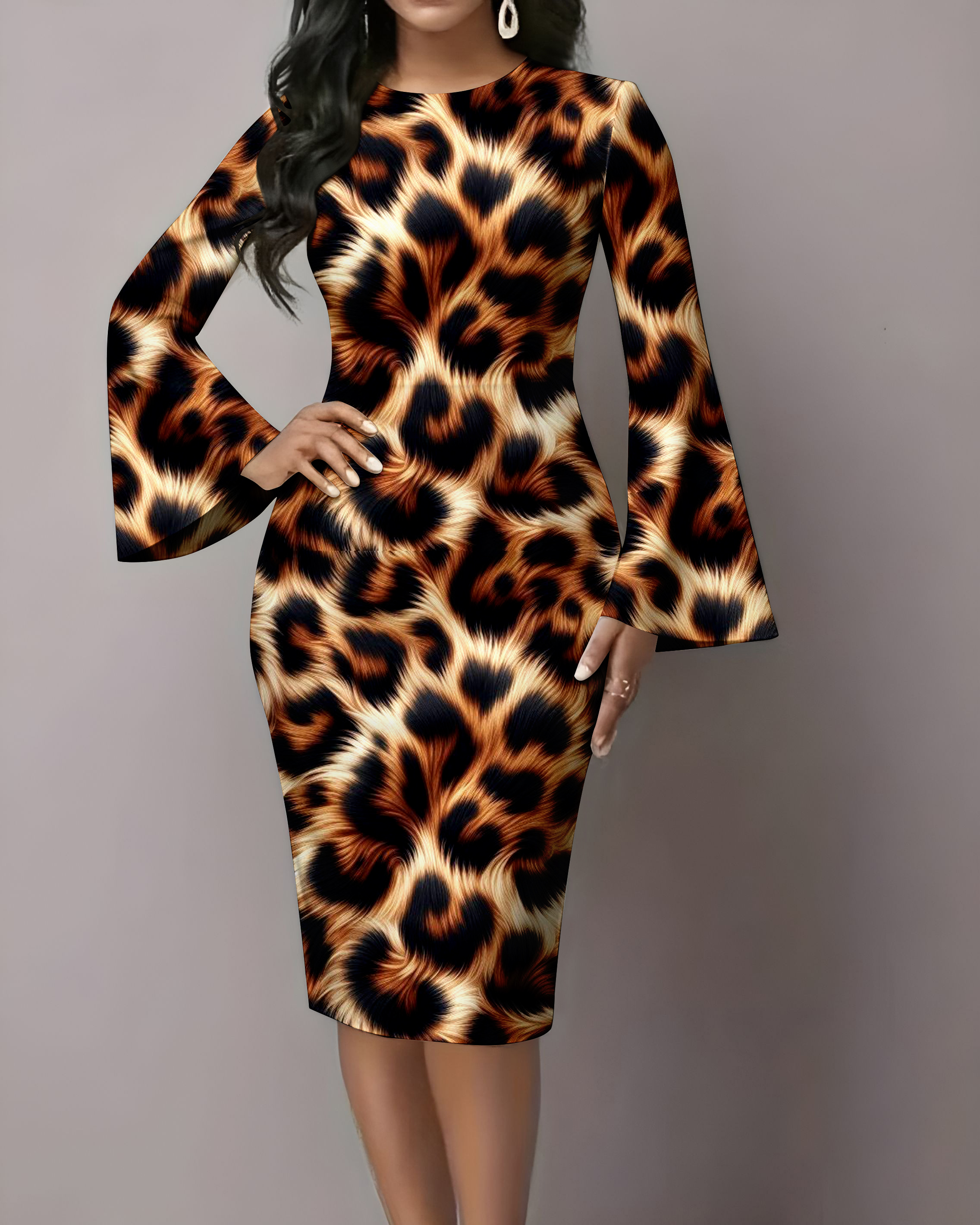Sexy Leopard Print Flared Sleeves Midi Bodycon Dresses