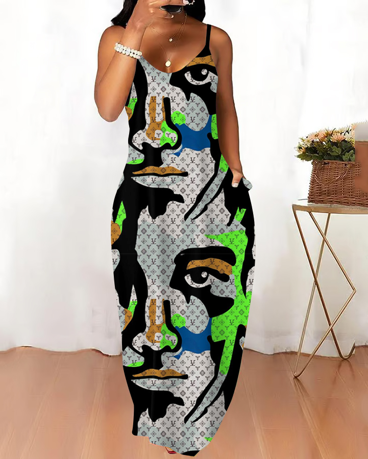 Sling Artistic Face Letters Pocket Maxi Dress
